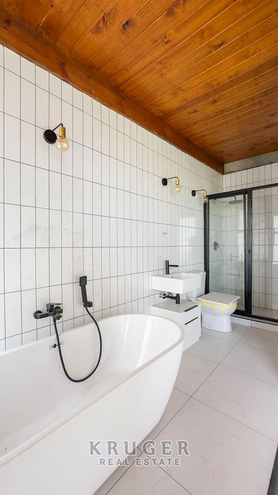 Stylish black plugs, modern lighting, and warm wooden ceilings that soften the space and add a welcoming, upmarket feel, give this unit a high-end, contemporary finish.