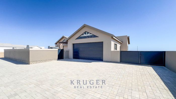 Coastal lifestyle in prime Kramersdorf near the Swakop River and dunes — open-plan living with indoor BBQ, showpiece floating steel-and-wood staircase and private courtyard. Three bedrooms, 2.5 baths, double garage.